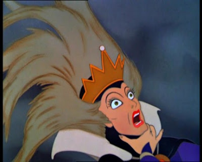 Lightening appears four times in Snow White and the Seven Dwarfs, this image documents the first time; then there is the queen using a thunder bolt to mix her potion (and there is lightening), lightening when Snow White falls "dead," and lightenting strikes the place where the queen tries escaping the seven dwarfs as she falls to her death. These are all connected together and meant to remind the audience of the journey the queen takes to her death. Rather odd pose for the queen in this picture above, isn't it, that she almost appears to be crucified in this image? The idea of the queen holding up both hands and the wind rushing at her (like the Crucifixtion) invokes Moses, parting the Red Sea, but this is an inversion, the unholy and the unclean, the summoning of dark arts instead of Holy Wisdom. Let's discuss what her costume says about her. Purple, as we know, is the color of royalty; for Christians, it is the color of Christ who should be "the King of our hearts," but for those who wear purple themselves (artisitically speaking) they are taking Christ's place. She wears a golden crown upon her head, but what has she done to earn it? A crown unearned is a crown all ready lost. There is a single pearl in it, all that might be said to be left of the queen's inner goodness and real wisdom, but she as she wantonly throws away her beauty, so she throws away this last pearl (please note there are no other jewels on the crown). Beneath the crown, the queen wears a black skull cap, covering her hair; hair symbolizes the thoughts, so basically, for intensive purposes, she doesn't have hair (we'll discuss her white hair coming through below) but only the black skull cap (black being death in the truest and most spiritual damning sense of the word and the skull cap means that death shuts out all other things, nothing else can get loose or show through). There is also a widow's peak on the cap, meaning that she is not married (Snow White's father, the king, is dead, of course, but this is her spiritual state). Her beauty exists for her sake, for her own enjoyment, and not for any other reason, that is why beauty to her becomes objectified, it's not subjective, along with all her other qualities (because she doesn't have any other qualities but power) and so beauty is being used to objectify herself to herself. The high, tall collar she wears "frames" her face because her face is all she has in this world and it's white to show us the "white of death" the whiteness of an old corpse (this element of the high collar is retained by both queens in Mirror, Mirror and Snow White and the Huntsman, so we had best pay particular attention to it). The red lining of her cape lets us know that her anger and appetites lie at the bottom of her motives and the red sash around her waist (normally a chastity belt) signifies that the queen is chaste, but from her disdain for others, not out of virtue, like Snow White.